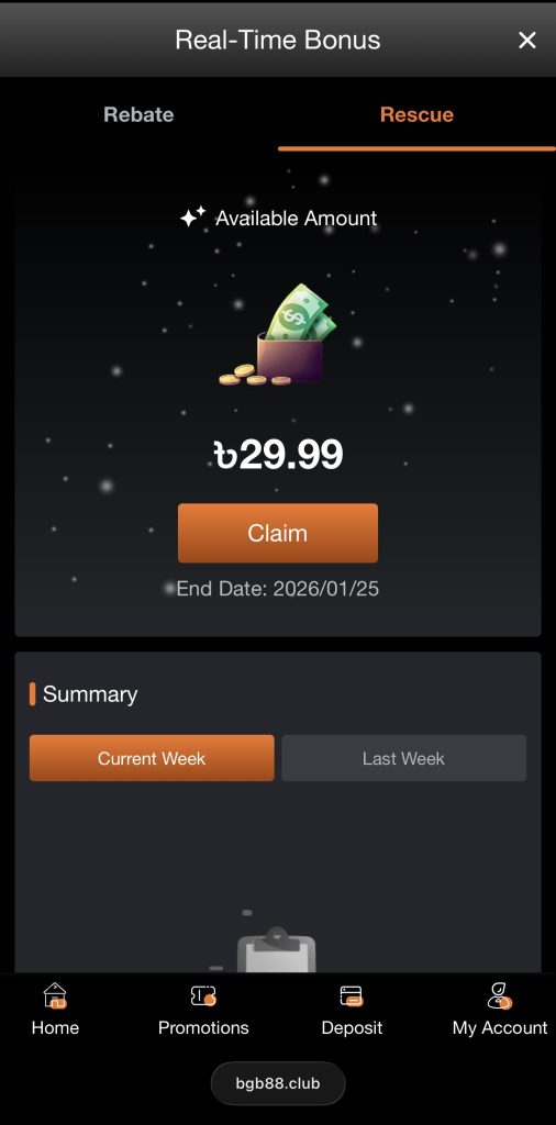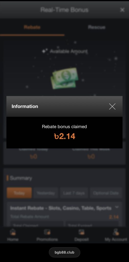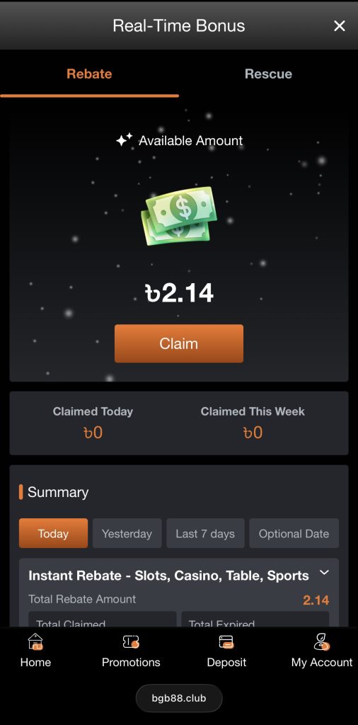 ৩. Available Amount-এর নিচে থাকা ক্লেইম বাটনে ক্লিক করে আপনার রিবেট বা রেসকিউ বোনাস রিডিম করুন
